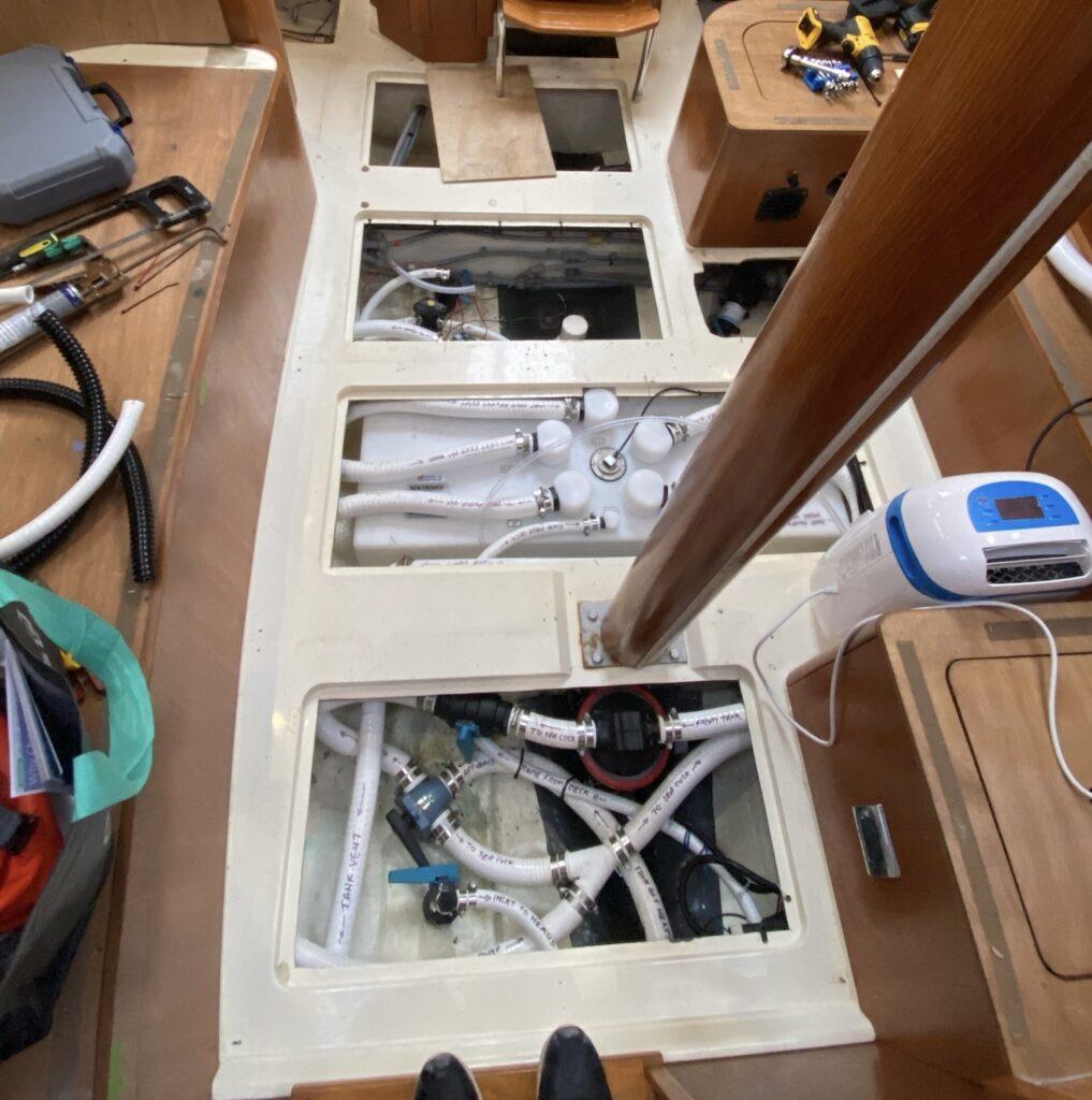 These naturally get clogged over time, plus urine, particularly male urine for some reason, mixes with saltwater to create a scale problem. We also discovered that some of the pipes which had been replaced were not of the required marine grade. All these problems can lead to a “leeching” of the smells from the pipes so they were all replaced!